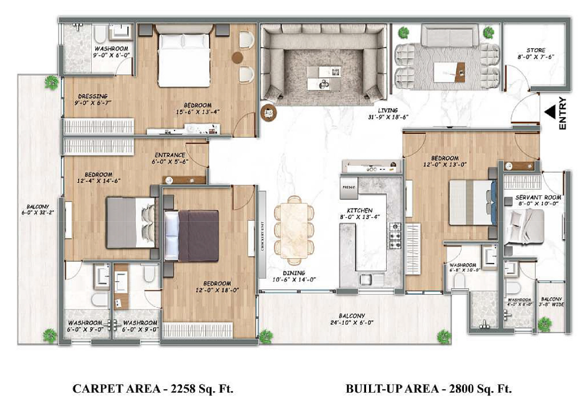 Choose from thoughtfully designed 3 BHK apartments in Blocks A, B, C, and D, or opt for the premium 4 BHK duplex apartments located in Blocks F and H, and duplex units in Blocks D-I to D-IV. Each residence features high-quality finishes such as modular kitchens with quartz tops, premium vitrified tiles, gypsum false ceilings with LED lights, UPVC windows with tempered glass and steel mesh, and fully furnished bedrooms with cupboards and dressing tables. The bathrooms come with anti-skid vitrified tiles, glass shower cabins, branded fittings, and ventilators to provide a luxurious and comfortable living experience.